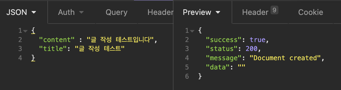 등록 버튼을 누를 시 Dictionary 타입의 제목과 글 내용을 담은 data 배열을 parameters에 담아 보내준다.
